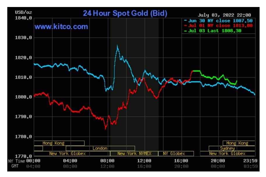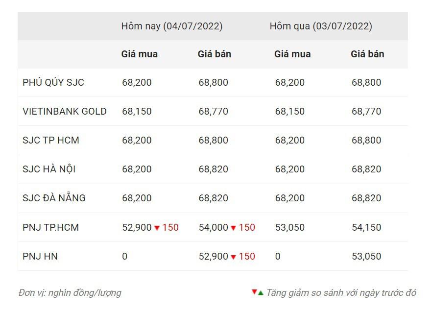 Giá vàng thế giới niêm yết trên Kitco lúc 9h ngày 4.7 ở mức 1.808,3 USD/oz. Trong khi đó, giá vàng trong nước giao dịch quanh ngưỡng 68,2-68,8 triệu đồng/lượng (mua vào - bán ra).