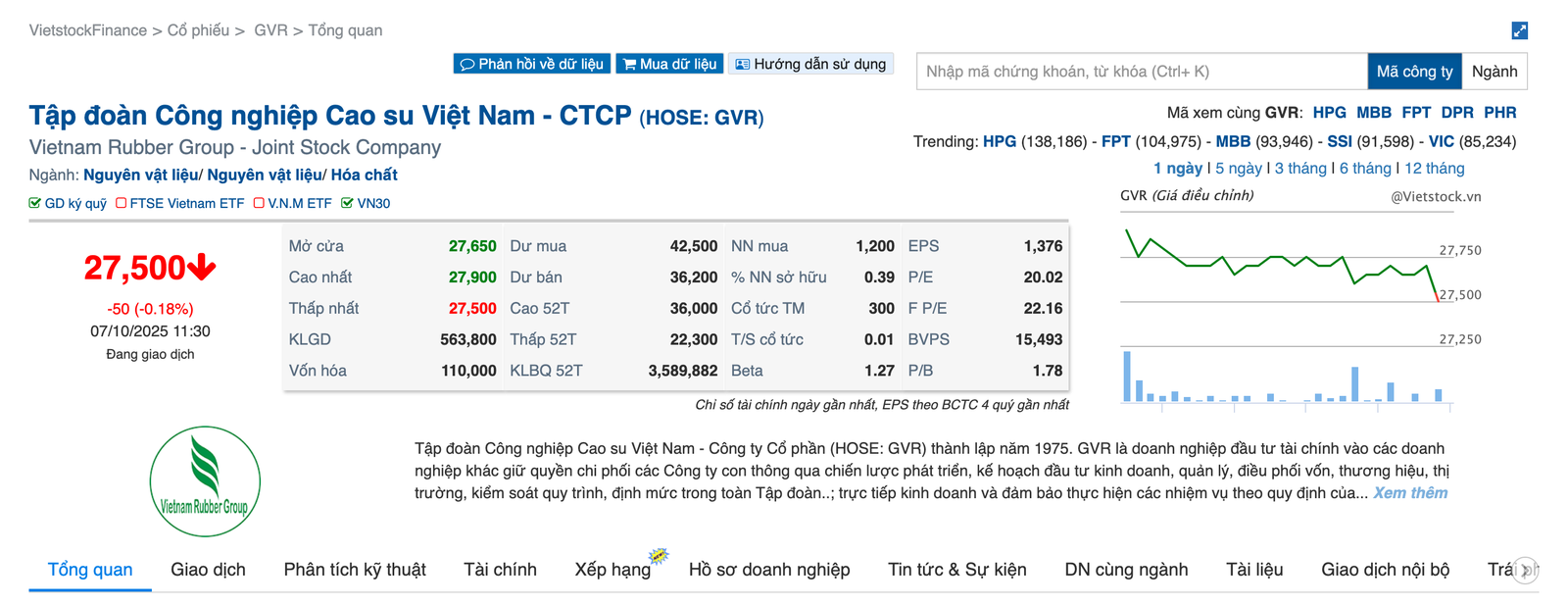 Cổ phiếu GVR đang giao dịch ở mức 27.500 đồng/cổ phiếu. Ảnh chụp màn hình website Vietstock.