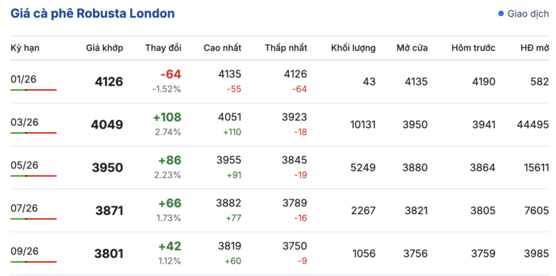 Kết thúc phiên giao dịch gần nhất, giá cà phê Robusta tại London ghi nhận tăng giảm đan xen trong các kỳ giao hàng. Cụ thể, kỳ giao tháng 1/2026 giảm 64 USD/tấn, xuống mức 4126 USD/tấn. Trong khi đó, hợp đồng giao kỳ hạn tháng 9/2026 đảo chiều tăng 42 USD/tấn, đạt mức 3801 USD/tấn.