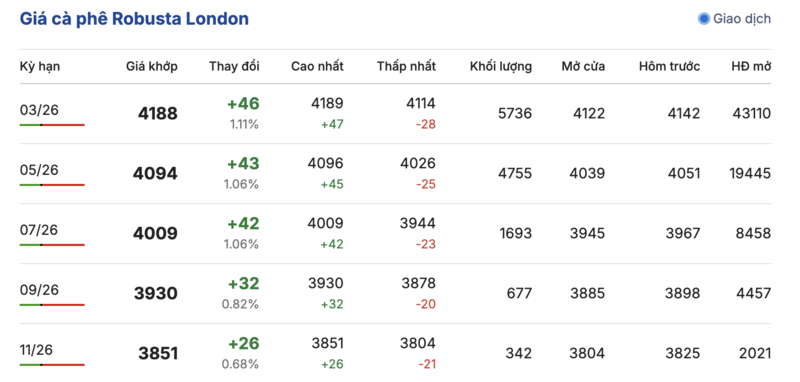 Kết thúc phiên giao dịch gần nhất, giá cà phê Robusta tại London tiếp tục ghi nhận phiên tăng giá đồng loạt trong các kỳ giao hàng. Cụ thể, kỳ giao tháng 1/2026 tăng 46 USD/tấn, lên mức 4188 USD/tấn. Trong khi đó, hợp đồng giao kỳ hạn tháng 9/2026 cũng tăng 26 USD/tấn, đạt mức 3851 USD/tấn.