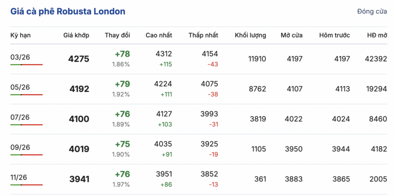 Kết thúc phiên giao dịch gần nhất, giá cà phê Robusta tại London tiếp tục ghi nhận phiên tăng giá đồng loạt trong các kỳ giao hàng. Cụ thể, kỳ giao tháng 1/2026 tăng 78 USD/tấn, lên mức 4275 USD/tấn. Trong khi đó, hợp đồng giao kỳ hạn tháng 9/2026 cũng tăng 76 USD/tấn, đạt mức 3941 USD/tấn.