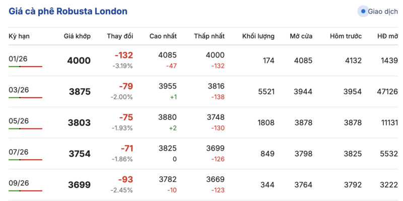 Kết thúc phiên giao dịch gần nhất, giá cà phê Robusta tại London đảo chiều giảm đồng loạt trong các kỳ giao hàng. Cụ thể, kỳ giao tháng 1/2026 giảm mạnh 132 USD/tấn, xuống mức 4000 USD/tấn. Hợp đồng giao kỳ hạn tháng 9/2026 cũng giảm mạnh 93 USD/tấn, đạt mức 3699 USD/tấn.