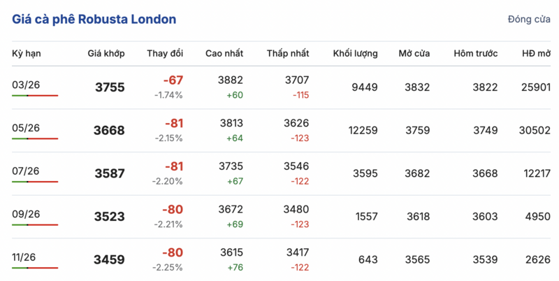 Kết thúc phiên giao dịch gần nhất, giá cà phê Robusta tại London tiếp tục sụt giảm sâu đồng loạt trong các kỳ giao hàng. Cụ thể, kỳ giao tháng 1/2026 giảm 67 USD/tấn, xuống mức 3755 USD/tấn. Trong khi đó, hợp đồng giao kỳ hạn tháng 11/2026 cũng giảm 80 USD/tấn, đạt mức 3459 USD/tấn.