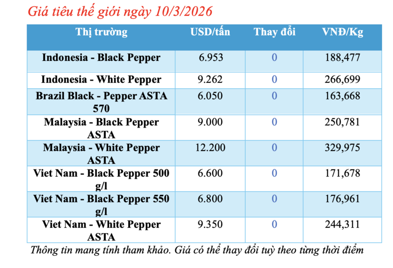 Giá tiêu thế giới hôm nay 10/3/2026: Đi ngang