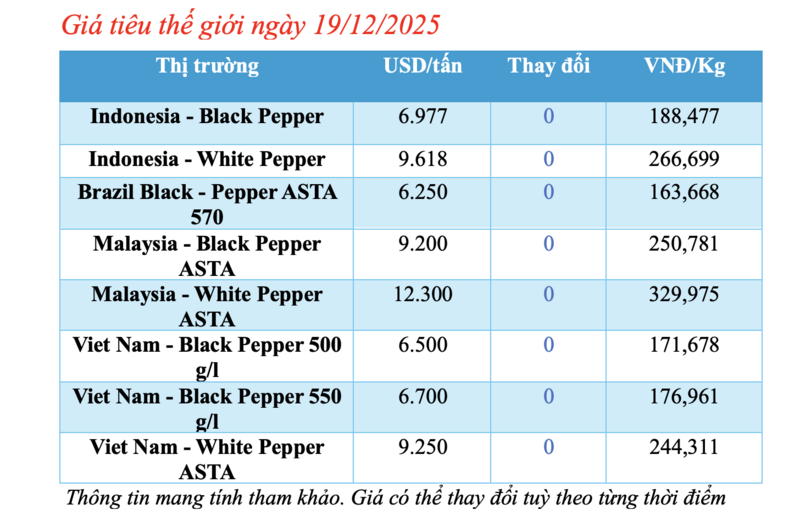 Cập nhật giá tiêu thế giới từ Hiệp hội Hồ tiêu Quốc tế (IPC) sáng 19/12/2025, hồ tiêu xuất khẩu hôm nay không ghi nhận biến động. Các thị trường đều ổn định giá so với phiên giao dịch hôm qua.
