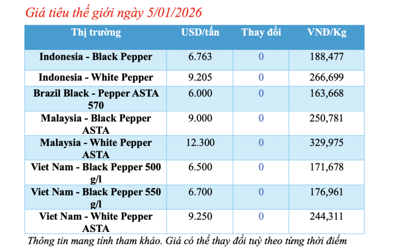Tại Malaysia, giá tiêu đen ASTA hiện đang ổn định ở mức 9.000 USD/tấn. Giá tiêu trắng ASTA tại thị trường này trong ngày hôm nay đạt 12.300 USD/tấn, không biến động so với ngày hôm qua.