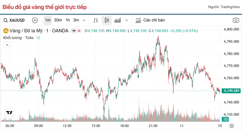 Theo Kitco, giá vàng thế giới ghi nhận lúc 4h30 hôm nay theo giờ Việt Nam giao ngay ở mức 4,749.68 USD/ounce. Giá vàng hôm nay giảm 0,92% so với hôm qua. Quy đổi theo tỷ giá USD trên thị trường tự do (26.668 VND/USD), vàng thế giới có giá khoảng 152,7 triệu đồng/lượng (chưa tính thuế, phí). Như vậy, giá vàng miếng SJC đang cao hơn giá vàng quốc tế khoảng 20 triệu đồng/lượng.