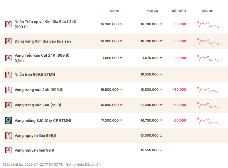 | SJC | 167,9 | 170,4 | 167,3 | 169,8 | -0,6 | -0,6 |