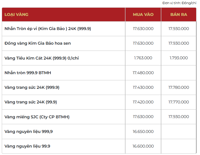 Bảo Tín Mạnh Hải niêm yết giá nhẫn tròn ép vỉ Kim Gia Bảo ở mức 176,3-179,3 triệu đồng/lượng (mua vào - bán ra), tăng 7,3 triệu đồng/lượng cả hai chiều mua vào và bán ra so với chốt phiên giao dịch tuần trước.