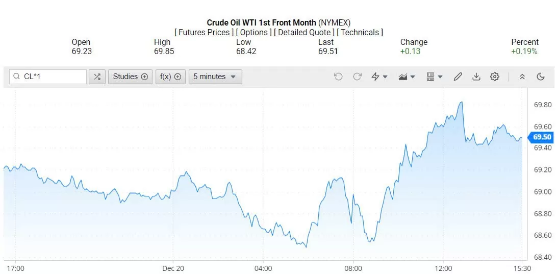 Ghi nhận trên Oilprice lúc 4h30 ngày 21/12/2024 (theo giờ Việt Nam), giá dầu WTI ở mốc 69,50 USD/thùng, tăng 0,19% (tương đương tăng 0,13 USD/thùng).