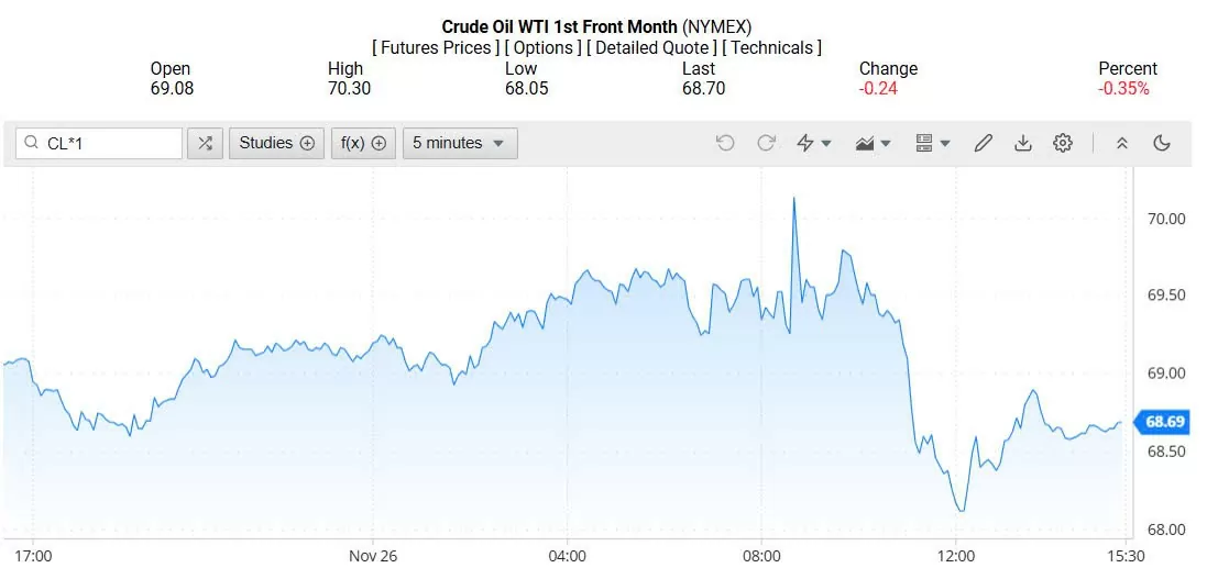 Ghi nhận trên Oilprice lúc 5h ngày 27/11/2024 (theo giờ Việt Nam), giá dầu WTI ở mốc 68,69 USD/thùng,giảm 0,35% (tương đương giảm 0,24 USD/thùng).