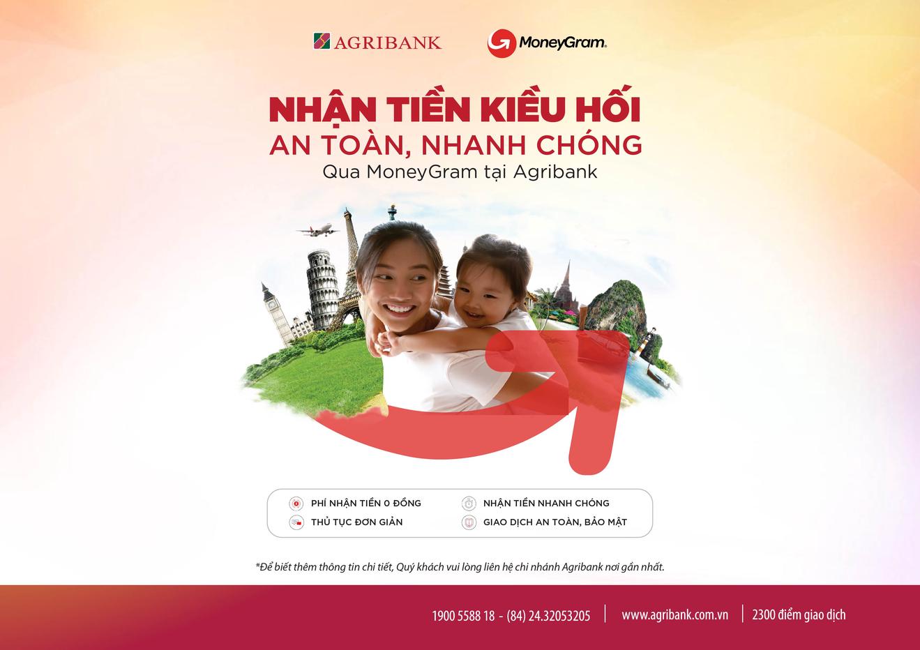 MoneyGram là công ty cung cấp dịch vụ chuyển và nhận tiền nhanh hàng đầu trên toàn thế giới với hơn 350.000 đại lý trên 200 quốc gia và vùng lãnh thổ, trong đó có hơn 80 quốc gia hiện đã có thể thực hiện chuyển tiền trực tuyến. Hợp tác giữa Agribank và MoneyGram mang tới cho khách hàng cá nhân dịch vụ nhận tiền quốc tế với nhiều tiện ích vượt trội: