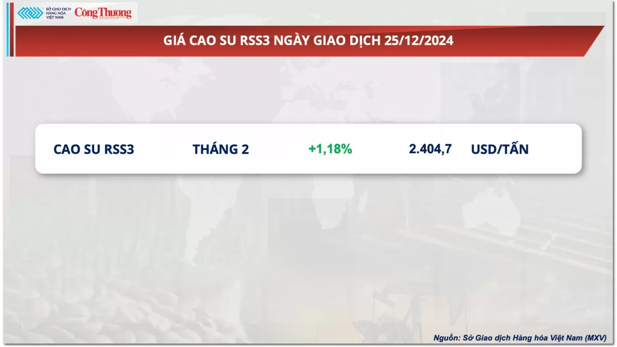 Sở Giao dịch Hàng hóa Việt Nam (MXV) cho biết, ngày hôm qua (25/12), hầu hết các Sở giao dịch hàng hóa lớn trên thế giới nghỉ lễ Giáng sinh. Cao su RSS3 là mặt hàng duy nhất vẫn còn giao dịch khá sôi động trên Sở Giao dịch Hàng hóa Osaka. Đóng cửa, giá mặt hàng này tăng 1,18% lên mức 2.404 USD/tấn nhờ kỳ vọng các chính sách kích thích kinh tế bổ sung của Trung Quốc - quốc gia đóng vai trò quan trọng trong dòng chảy thương mại cao su toàn cầu.