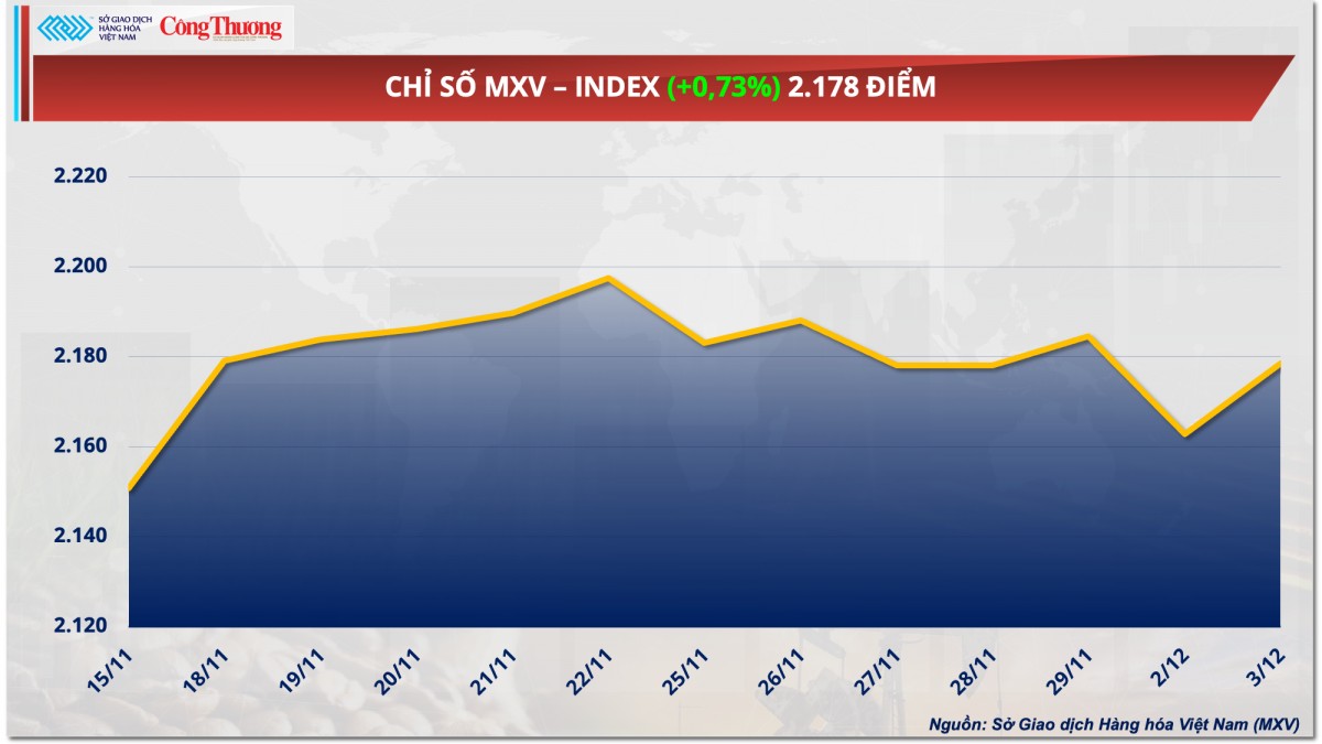 Theo Sở Giao dịch Hàng hóa Việt Nam (MXV), lực mua chiếm ưu thế trên thị trường hàng hóa nguyên liệu thế giới trong ngày hôm qua (3/12). Đóng cửa, chỉ số MXV-Index tăng 0,73% lên 2.178 điểm. Kim loại và năng lượng là hai nhóm hấp dẫn được dòng tiền đầu tư trong suốt phiên giao dịch. Trong bối cảnh tình hình địa chính trị leo thang, rủi ro căng thẳng thương mại gia tăng, giá của toàn bộ 10 mặt hàng kim loại đồng loạt đi lên. Bên cạnh đó, thị trường năng lượng, bao gồm dầu thô cũng ghi nhận đà tăng giá tích cực.