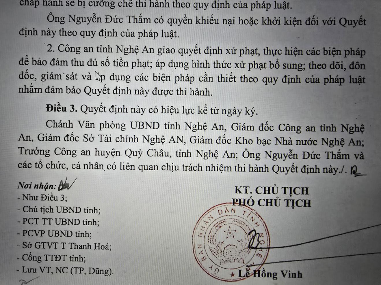 Theo đó, Công an tỉnh Nghệ An giao quyết định xử phạt, thực hiện các biện pháp để đảm bảo thu đủ số tiền phạt, áp dụng hình thức xử phạt bổ sung, theo dõi, đôn đốc, giám sát và áp dụng các biện pháp cần thiết theo quy định của pháp luật.