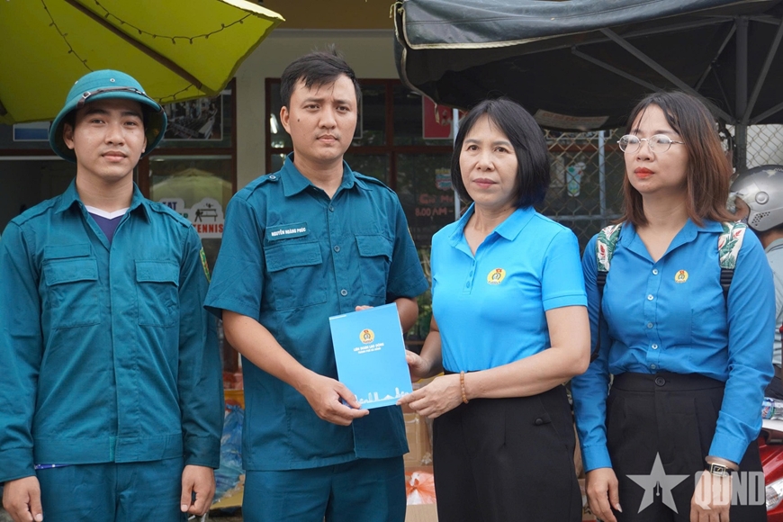 Liên đoàn Lao động TP Đà Nẵng trao tặng quà, động viên tinh thần các lực lượng đang ngày đêm hỗ trợ người dân khắc phục hậu quả mưa lũ.  |