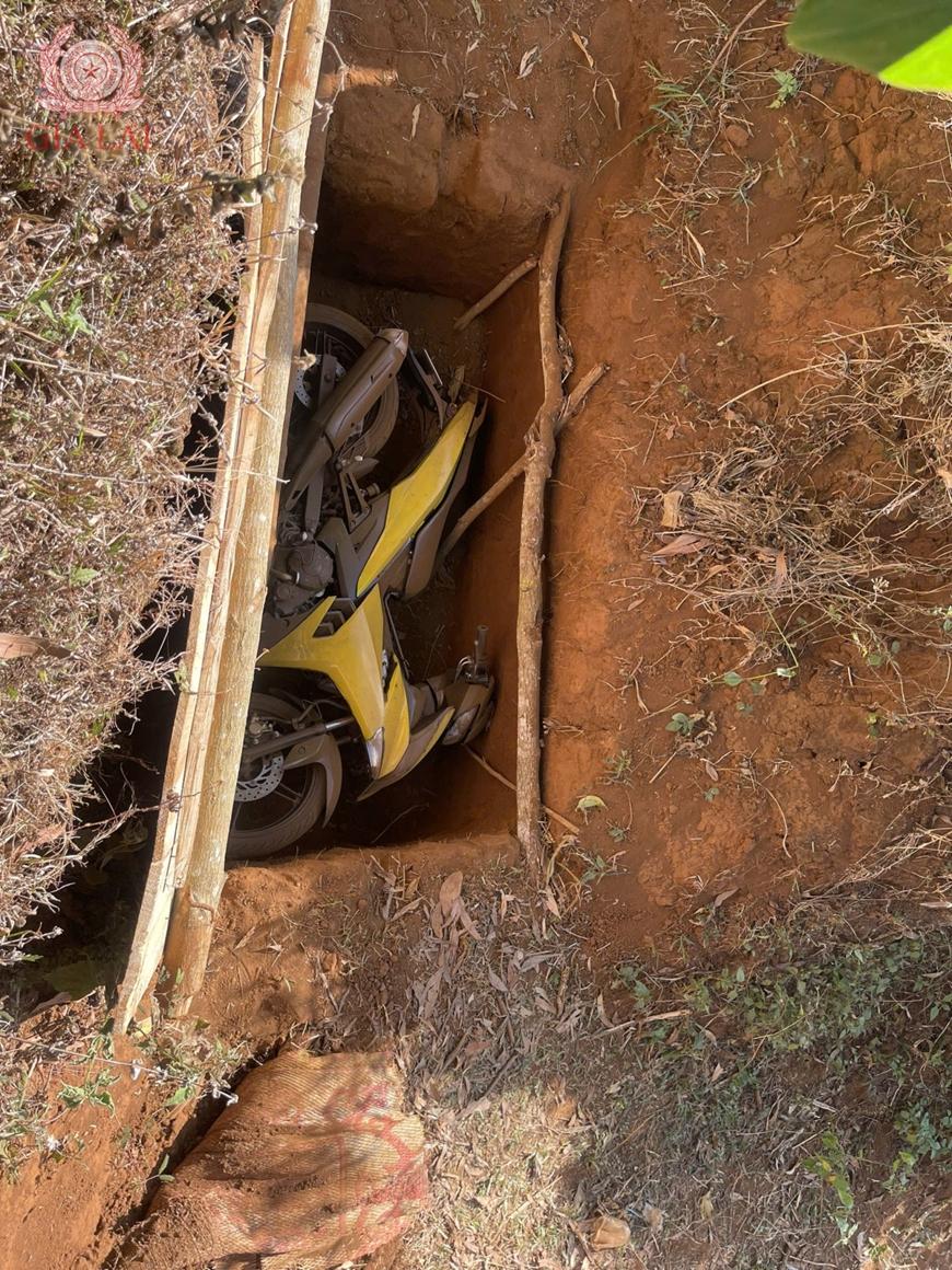 Lực lượng công an tìm thấy chiếc xe tang vật các đối tượng chôn giấu sau khi gây án. |