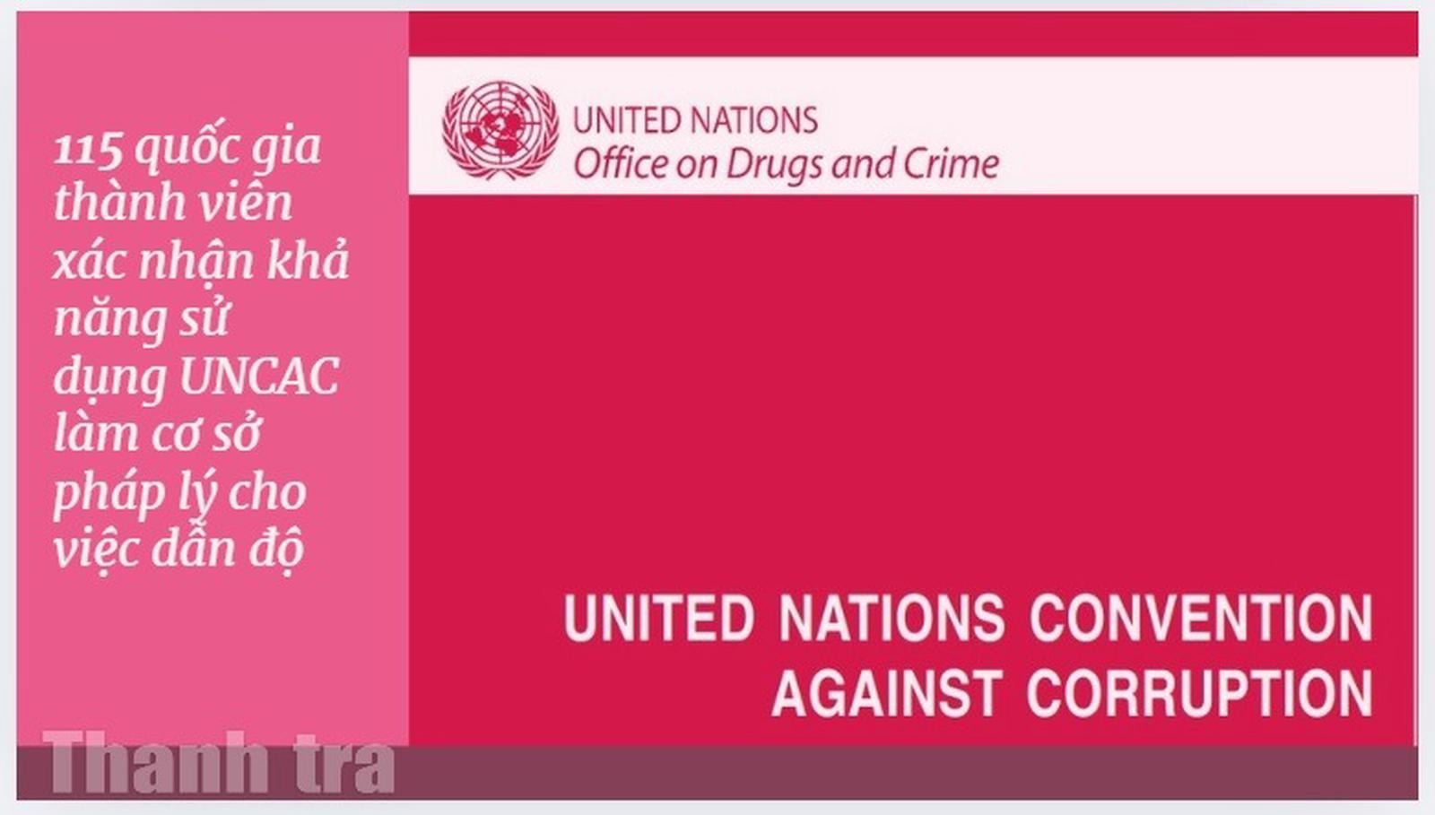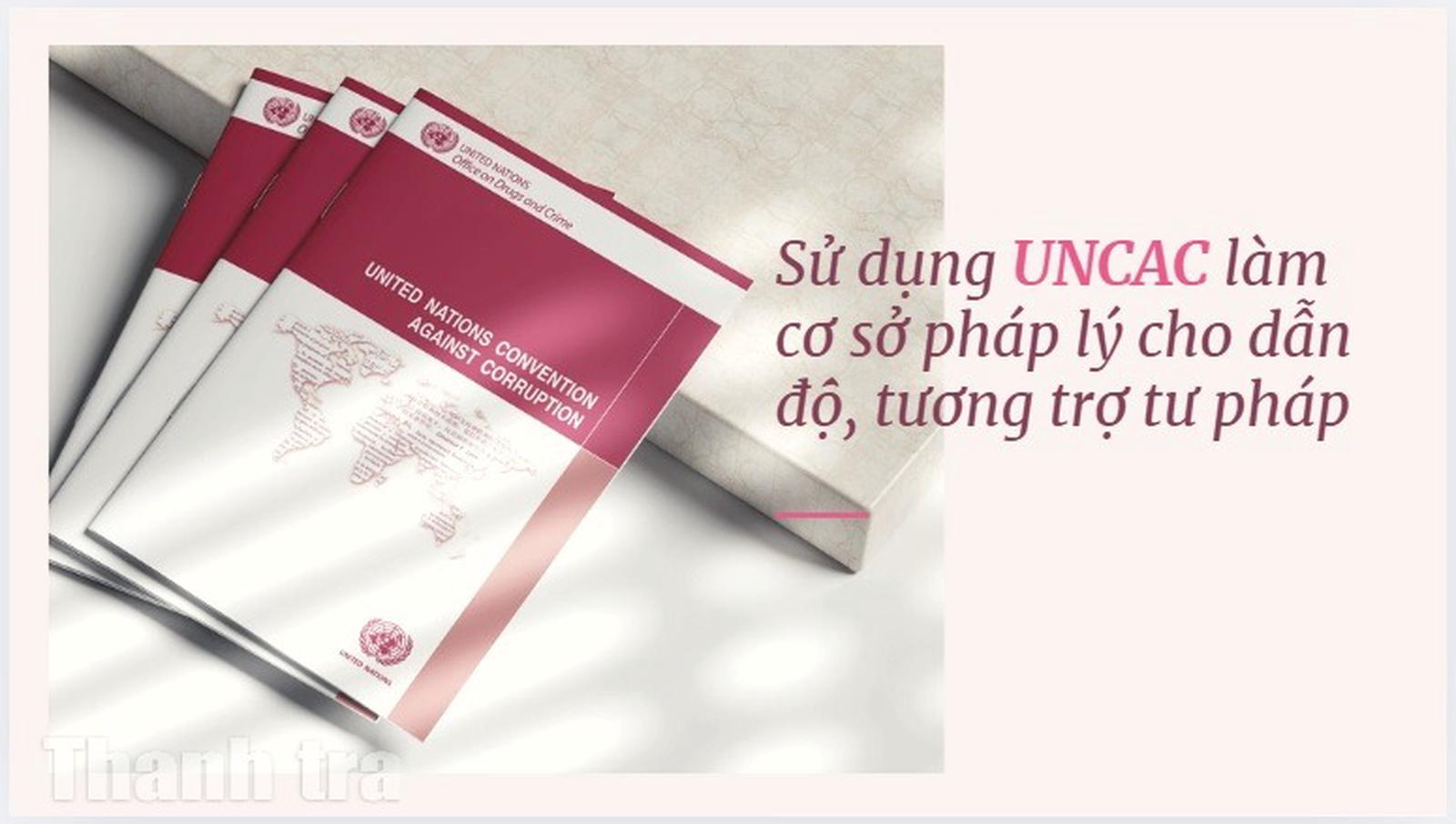 Sau khi cập nhật tiến độ thực hiện các nhiệm vụ của Cuộc họp Nhóm chuyên gia liên chính phủ mở rộng nhằm tăng cường hợp tác quốc tế, Ban Thư ký UNCAC (Cơ quan Phòng, chống Ma tuý và Tội phạm Liên hợp quốc – UNODC) mới đây đã có Báo cáo về việc sử dụng UNCAC làm cơ sở pháp lý cho việc dẫn độ, tương trợ tư pháp, hợp tác thực thi pháp luật, tố tụng dân sự và hành chính và thu hồi tài sản.