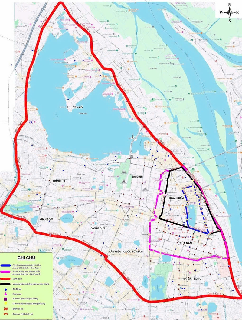 Thành phố xác định giai đoạn 2 (ngày 1/1/2027-31/12/2027) mở rộng khu vực thí điểm tại phường Hoàn Kiếm và Cửa Nam, gồm vùng lõi phường Hoàn Kiếm đã thực hiện ở giai đoạn 1 và 14 tuyến phố bao quanh thuộc phường Cửa Nam: Nguyễn Du, Hàn Thuyên, Trần Hưng Đạo, Trần Khánh Dư, Trần Quang Khải, Trần Nhật Duật, Hàng Đậu, Cửa Đông, Lý Nam Đế, Tôn Thất Thiệp, Điện Biên Phủ, Hàng Bông, Cửa Nam, Lê Duẩn.