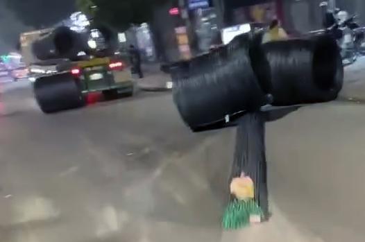 Những cuộn thép nặng hàng tấn lăn lóc trên đường. Ảnh chụp màn hình