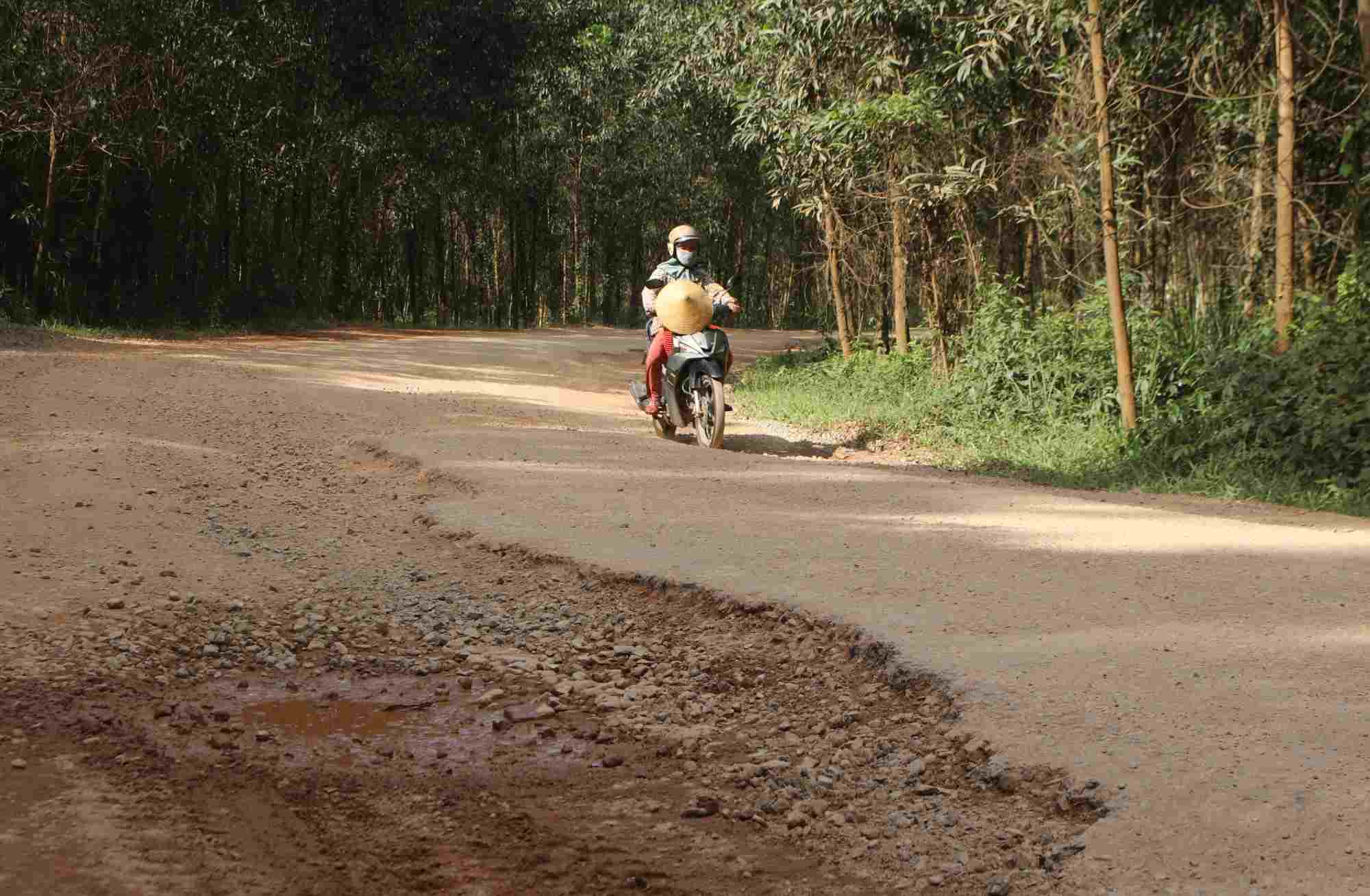 Nhiều đoạn đường bị bánh xe “khới” nát hai bên lề, dẫn đến lòng đường nhựa ngày càng bị hẹp dần. Cùng với đó là khối lượng đất đá, sạn sỏi xuất hiện dày đặc trên mặt đường khiến việc đi lại của người dân gặp phải rất nhiều nguy hiểm.
