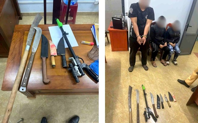 Qua làm việc, lực lượng công an vận động các đối tượng giao nộp nhiều hung khí nguy hiểm, gồm: 1 cây đao, 1 dao phát, 1 cây mác, 3 dao bầu và 1 súng cao su dạng nỏ bắn đạn bi.