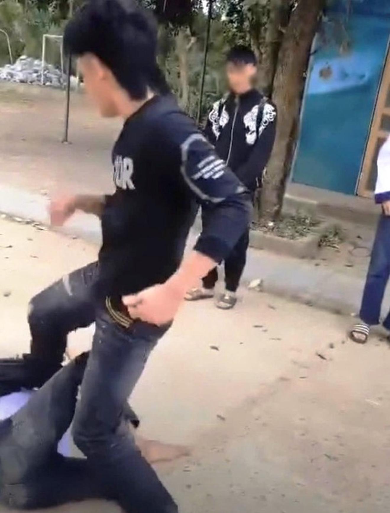 Đoạn video thứ nhất ghi lại cảnh 1 nam sinh bị liên tiếp đấm vào mặt, đá vào bụng và đầu cho đến khi gục xuống sân trường.