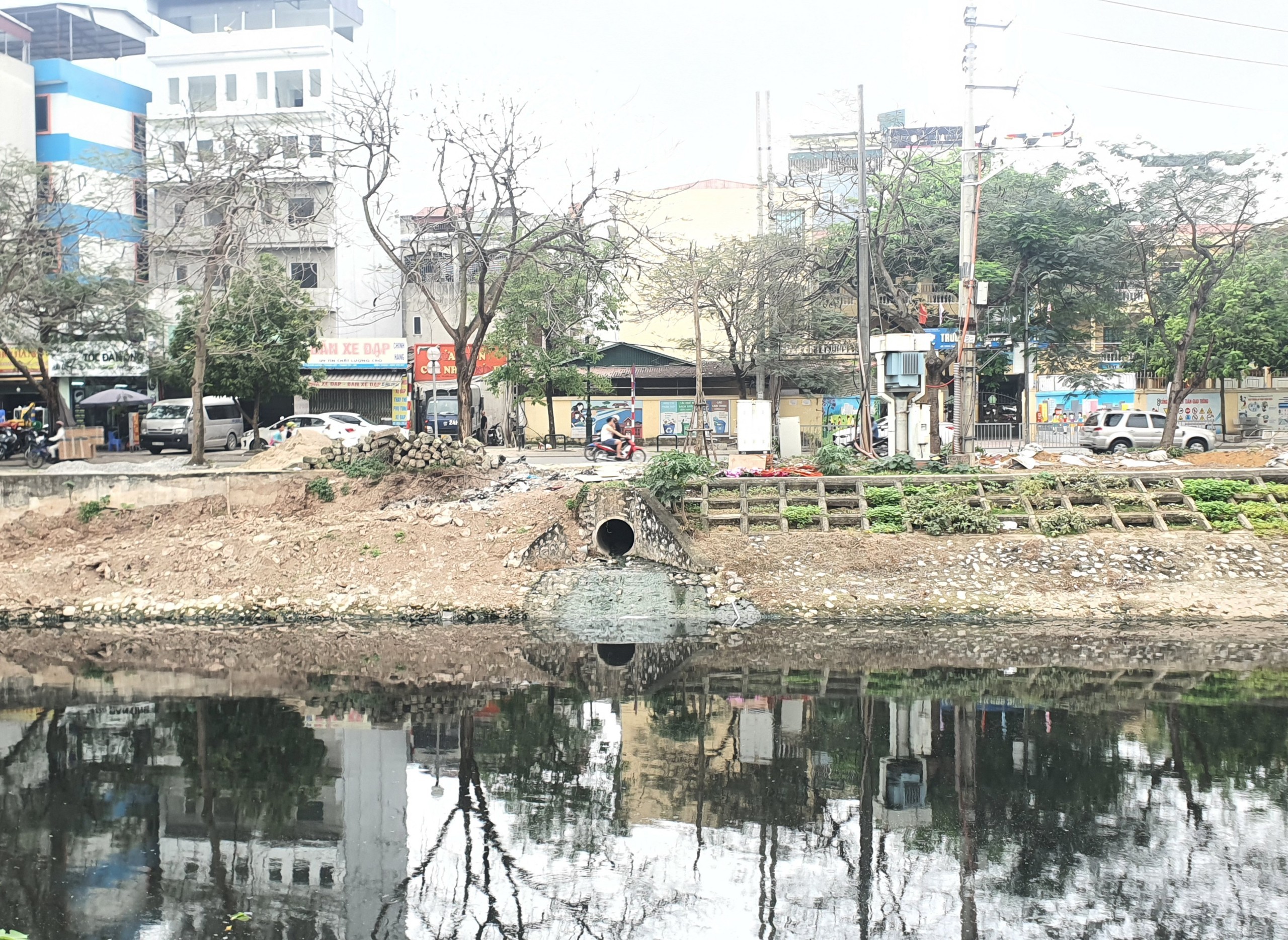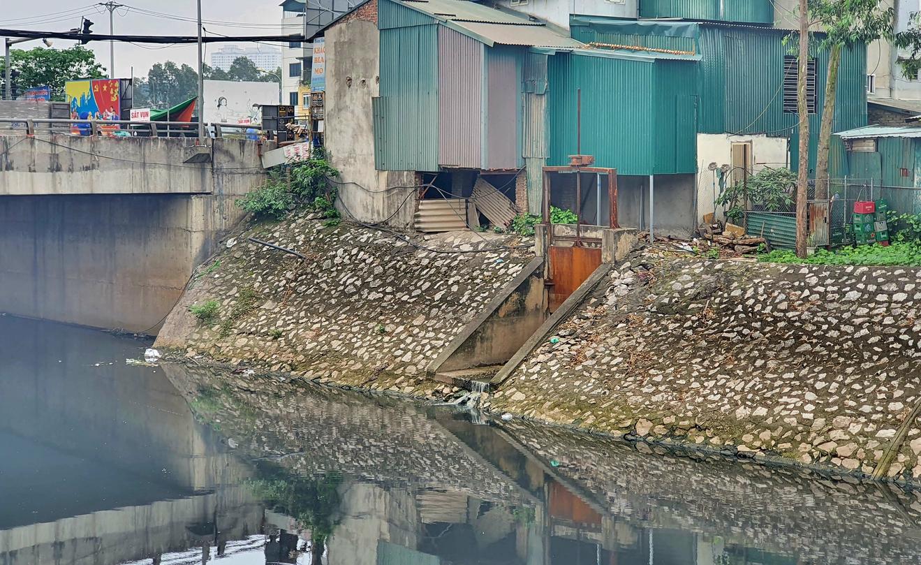 Sông Tô Lịch bị ô nhiễm nặng nề, nước sông đen kịt. Ảnh: HH