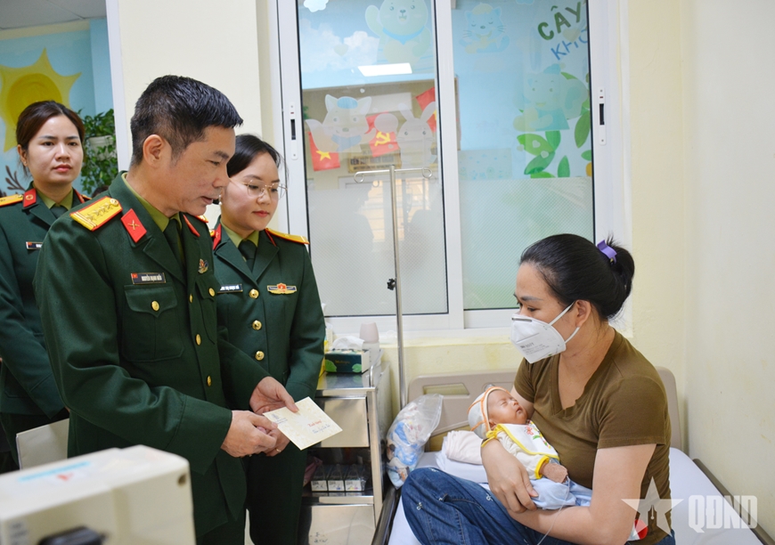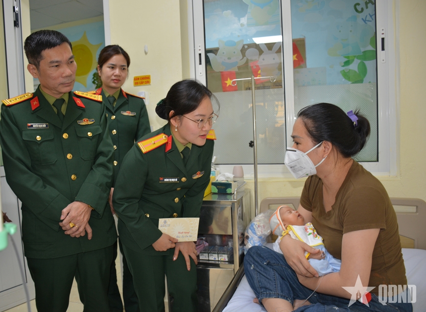 Thiếu tá QNCN Hoàng Thị Ngọc Hà, Chủ tịch Hội Phụ nữ cơ sở Cục Đối ngoại ân cần thăm hỏi bệnh nhi Ngô Diệu Linh (sinh ngày 5-1-2026) đang điều trị tại bệnh viện.