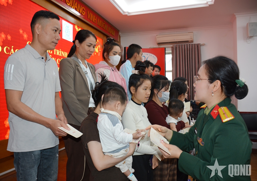 Đại tá Nguyễn Mạnh Hiếu, Chủ nhiệm Chính trị Cục Đối ngoại và đại diện Ban chấp hành Hội Phụ nữ cơ sở trao quà tặng bệnh nhi Ngô Diệu Linh.