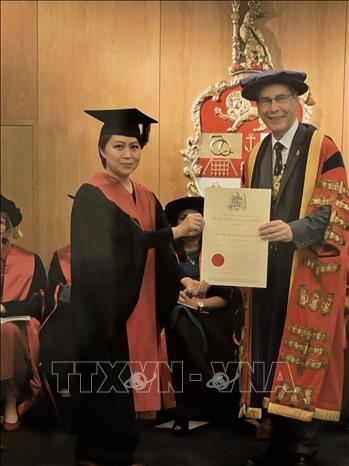 | Chủ tịch RCS, Tim Mitchell, trao chứng chỉ thành viên RCS cho bác sĩ Lê Diệp Linh tại trụ sở RCS ở London. |