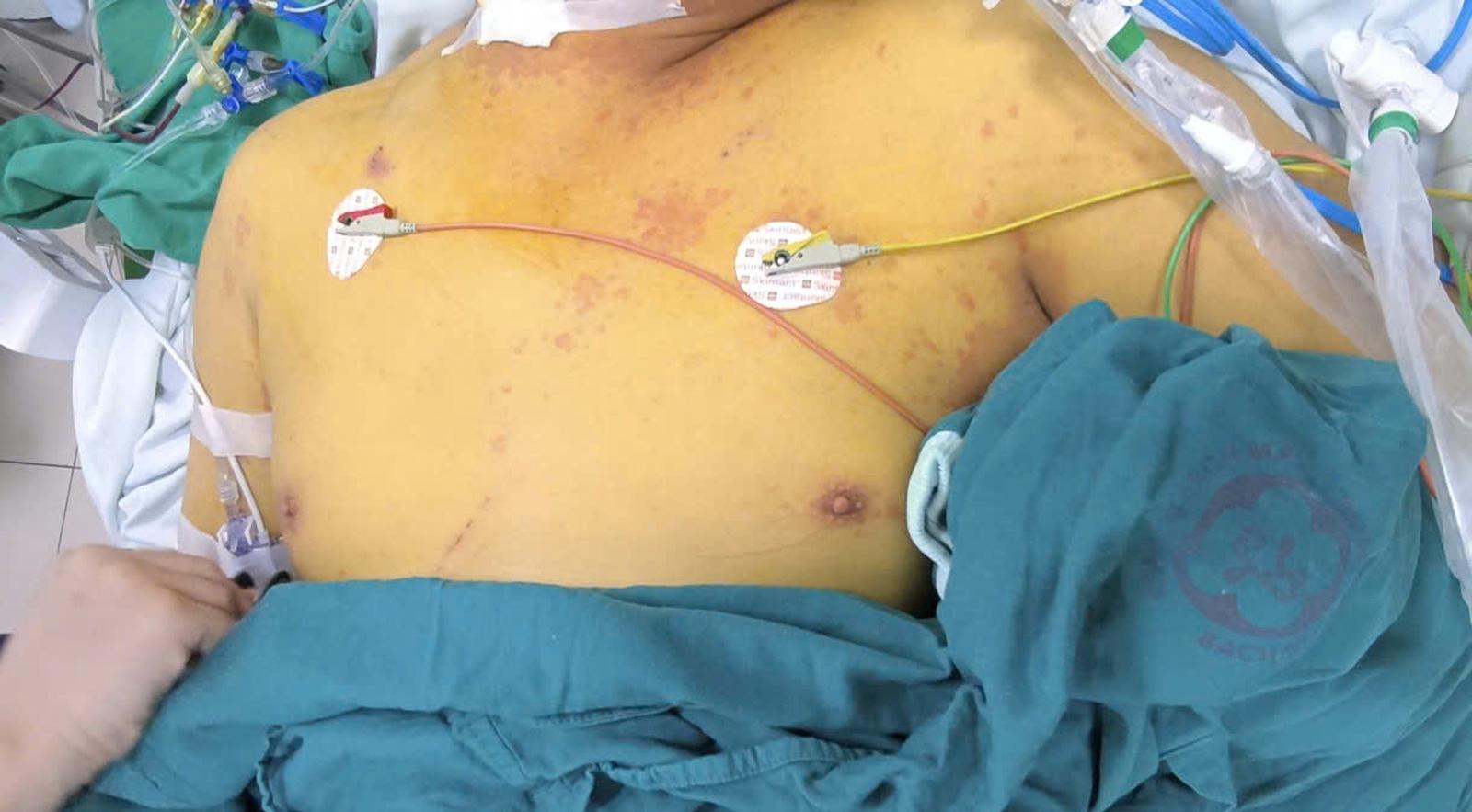 Bác sĩ Phan Văn Mạnh, Khoa Cấp cứu, Bệnh viện Bệnh Nhiệt đới Trung ương cho biết, bệnh nhân nhập viện trong tình trạng vàng mắt vàng da, nôn máu – thiếu máu nặng, sốc, toan chuyển hóa và suy đa tạng (suy thận, suy gan, suy tim), rối loạn đông máu. Bệnh nhân được chẩn đoán nhiễm Leptospira thể nặng (còn được gọi là bệnh Weil), tiên lượng tử vong rất cao. Người bệnh được xử trí nội soi dạ dày cấp cứu để cầm máu và truyền cấp các chế phẩm máu, đồng thời can thiệp hồi sức tích cực bằng đặt ống thở nội khí quản thở máy và lọc máu.