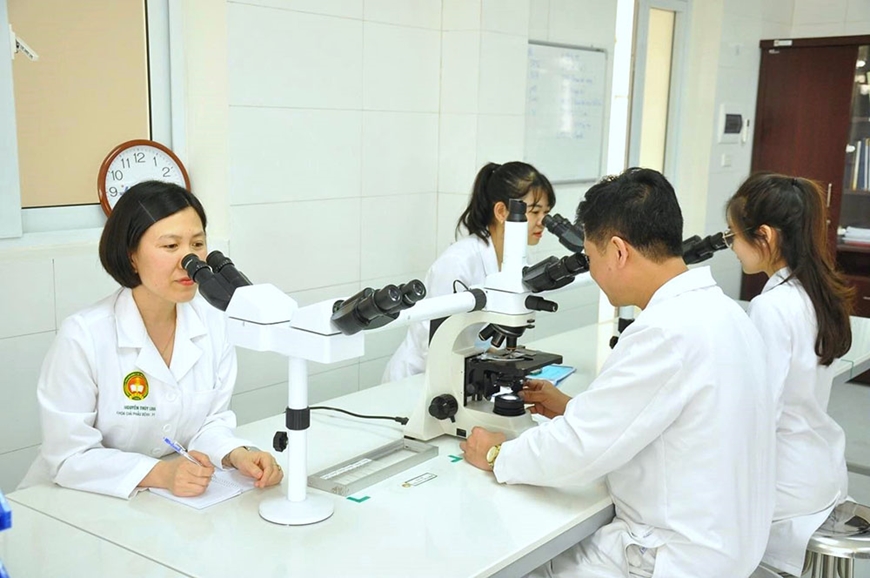 | Trung tá, TS Nguyễn Thùy Linh (ngoài cùng, bên trái) tham gia hội chẩn tiêu bản ca bệnh khó trên kính hiển vi 5 đầu. |