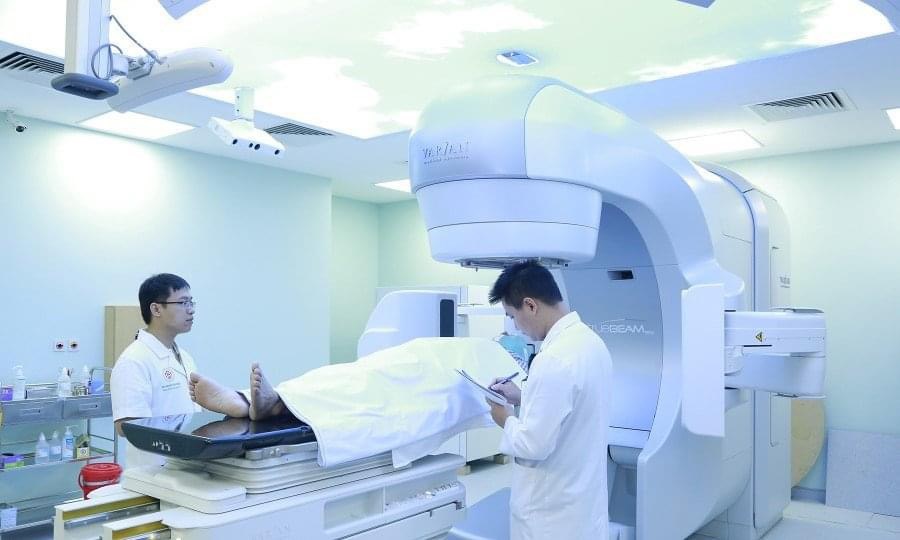 Bác sĩ, kỹ thuật viên Khoa Xạ trị-Xạ phẫu, Viện Ung thư, Bệnh viện Trung ương Quân đội 108 điều trị cho bệnh nhân. Ảnh: MAI HẰNG |