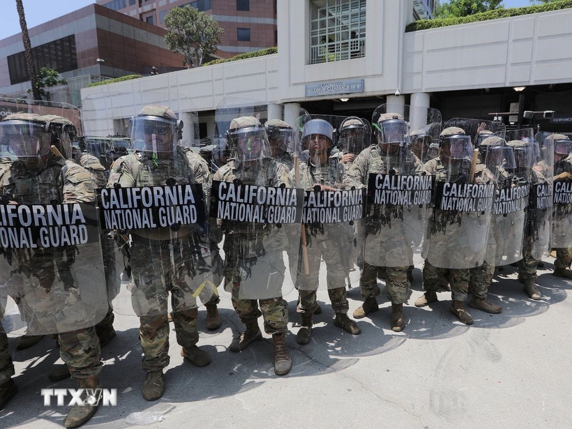 | Lực lượng Vệ binh quốc gia bang California được triển khai tại thành phố Los Angeles ngày 8-6. |
