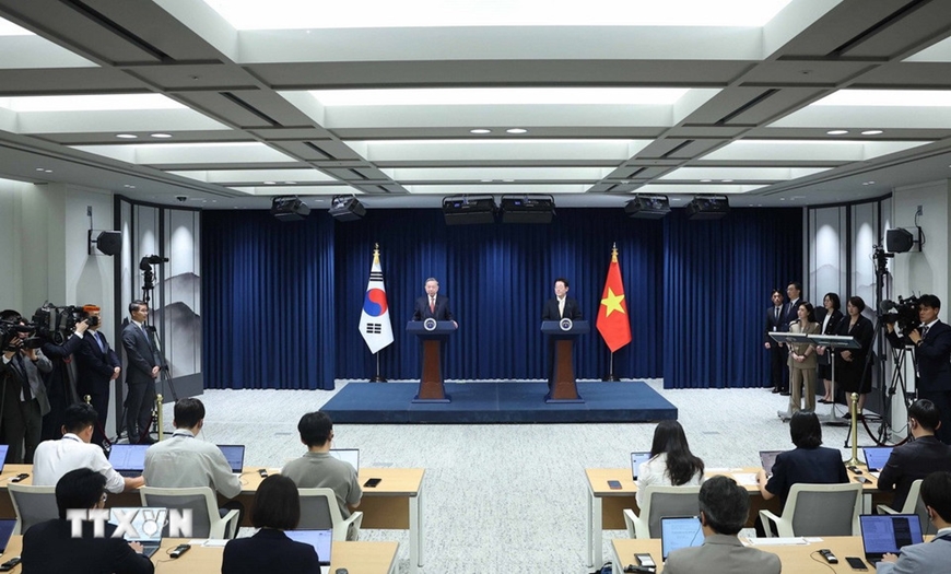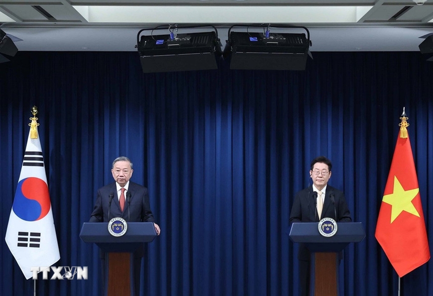 Tại cuộc gặp gỡ báo chí, Tổng Bí thư Tô Lâm và Tổng thống Hàn Quốc Lee Jae Myung nêu rõ trên tinh thần quan hệ Đối tác chiến lược toàn diện, hai bên đã trao đổi, thống nhất về một số định hướng lớn thúc đẩy quan hệ song phương trong thời gian tới.