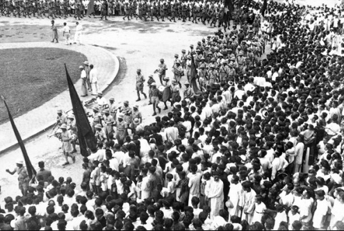| Quân giải phóng và Tự vệ Thành duyệt binh tại Quảng trường Nhà hát Lớn Hà Nội, tháng 8-1945. Ảnh tư liệu |