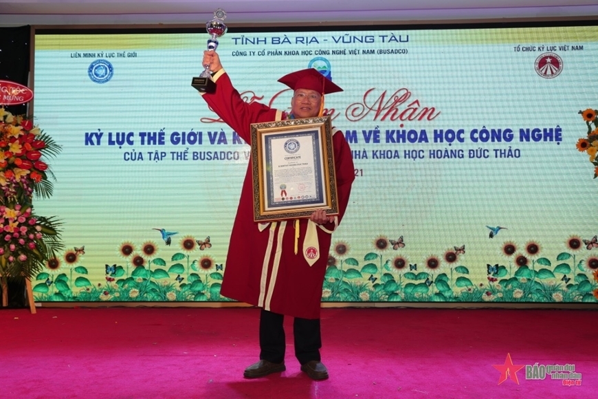 | Anh hùng Lao động Hoàng Đức Thảo được Hội đồng Liên minh Kỷ lục thế giới vinh danh năm 2020. |