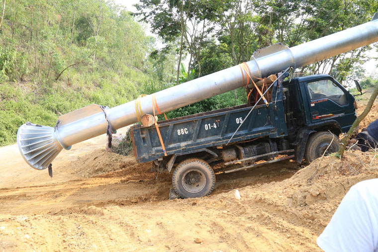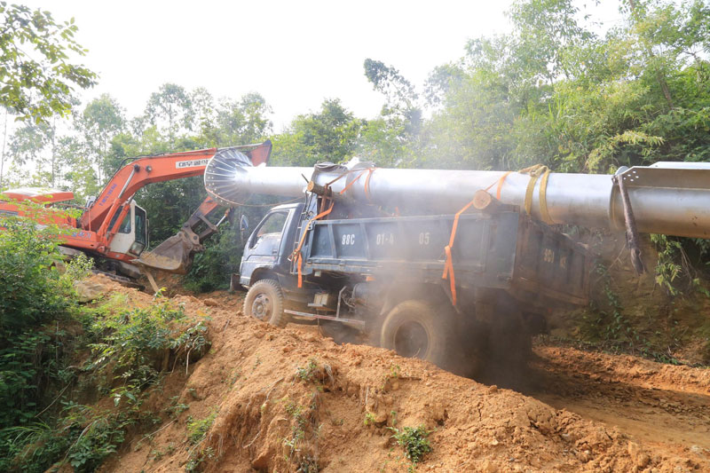 Vận chuyển hàng trăm tấn thép, dây dẫn, các thiết bị siêu trường để dựng các cột điện đồ sộ giữa địa hình núi cao, suối sâu là thử thách lớn đối với những người trên công trường.