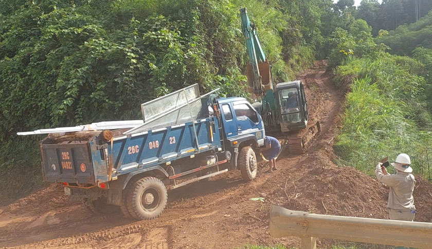 “Có hôm dốc đứng quá, phải nối cáp hai xe giật mãi mới qua được. Nhiều đoạn xe đứng chôn bánh cả buổi, máy xúc phải tới kéo liên tục”, kỹ sư Nguyễn Hữu Hùng – phụ trách kỹ thuật chia sẻ trong tiếng máy nổ rền vang.