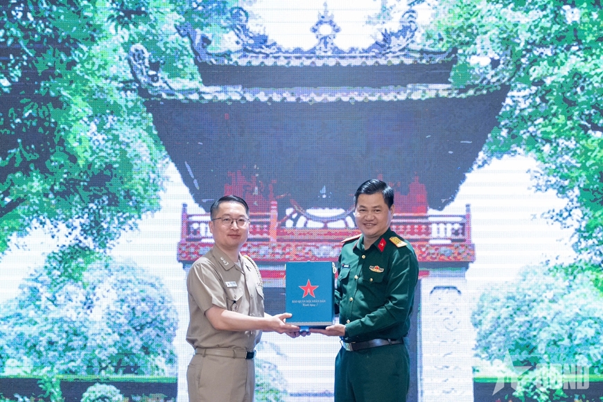 | Đại tá Nguyễn Hồng Hải trao quà lưu niệm tặng Trung tá Hải quân Park Jeong Hwan. Ảnh: VIỆT TRUNG |