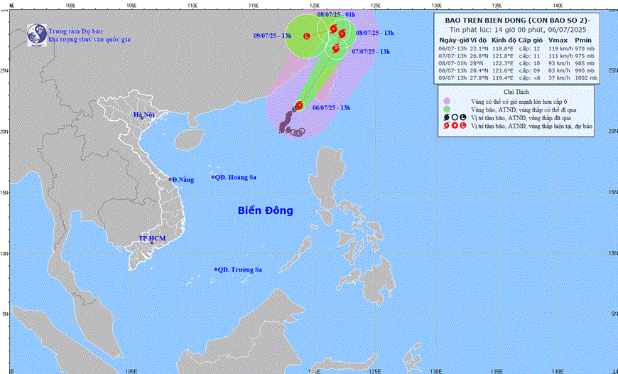 Trung tâm Dự báo Khí tượng Thủy văn Quốc gia cho biết, vào hồi 13 giờ chiều nay (6-7), tâm bão số 2 nằm ở khoảng 22,1 độ Vĩ Bắc; 118,8 độ Kinh Đông, trên vùng biển phía Đông Bắc khu vực Bắc Biển Đông.