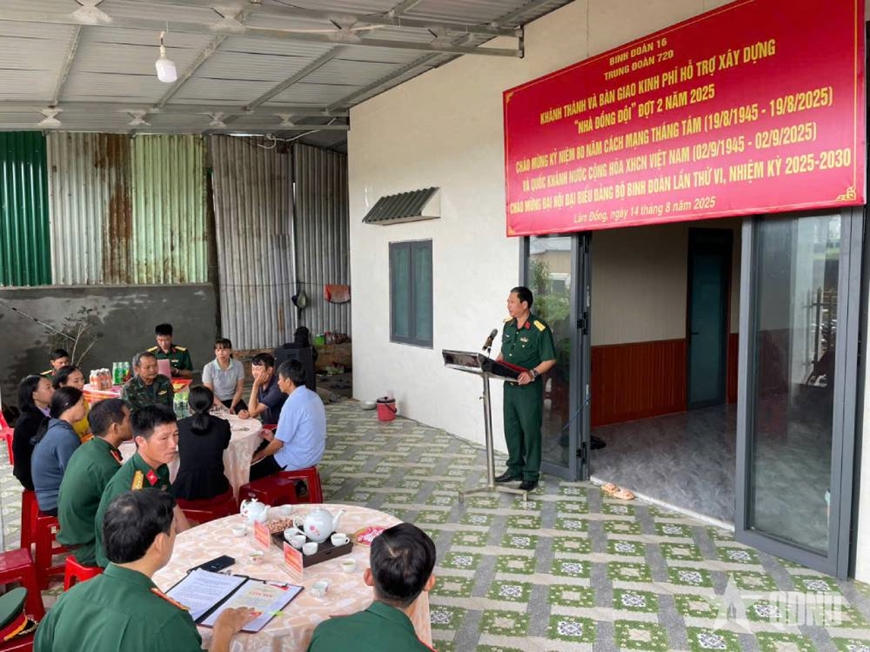 Theo đó, dịp này đơn vị trao tặng cho 5 hộ gia đình là công nhân, người lao động của Trung đoàn bao gồm: Đồng chí Nguyễn Thị Tám, Đội sản xuất 1; Nguyễn Văn Nghiêm, Đội sản xuất 2; Phạm Văn Tài, Đội sản xuất 8; Vũ Thị Huệ, Giáo viên trường mầm non Hoa Sim (thuộc Trung đoàn 720). Nhà đồng đội của các hộ gia đình trên được xây dựng tại địa bàn xã Quảng Tân tỉnh Lâm Đồng và nhà đồng chí Lê Việt Hồng, Đội sản xuất 5, được xây dựng tại xã Quảng Tín, tỉnh Lâm Đồng.