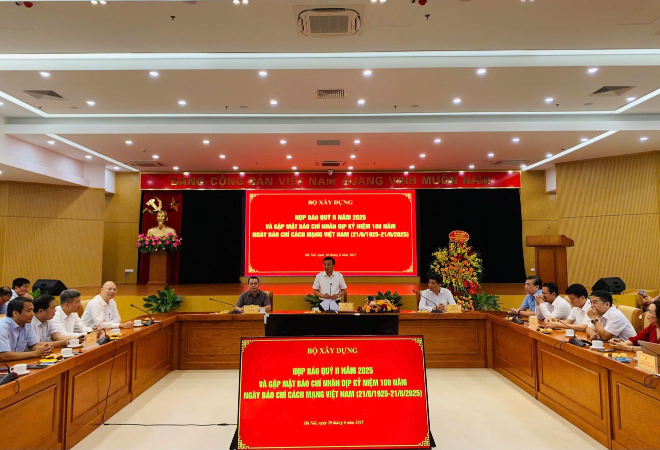 Quang cảnh buổi họp báo quý II năm 2025 và gặp mặt báo chí nhân ngày 21/6 được Bộ Xây dựng tổ chức sáng nay (20/6). Ảnh: TQ