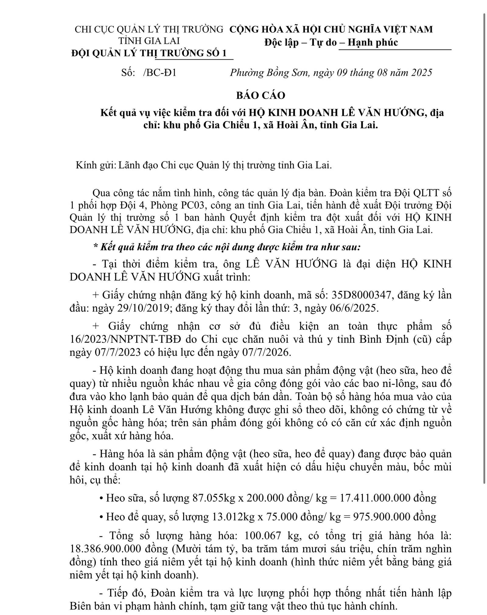 Được biết, ngày 9/8/2025, đoàn kiểm tra Đội QLTT số 1 phối hợp Đội 4, Phòng PC03, Công an tỉnh Gia Lai, tiến hành đề xuất Đội trưởng Đội Quản lý thị trường số 1 ban hành quyết định kiểm tra đột xuất đối với hộ kinh doanh của vợ chồng ông Lê Văn Hướng và bà Trần Thị Thắm, địa chỉ khu phố Gia Chiểu 1, xã Hoài Ân, tỉnh Gia Lai.