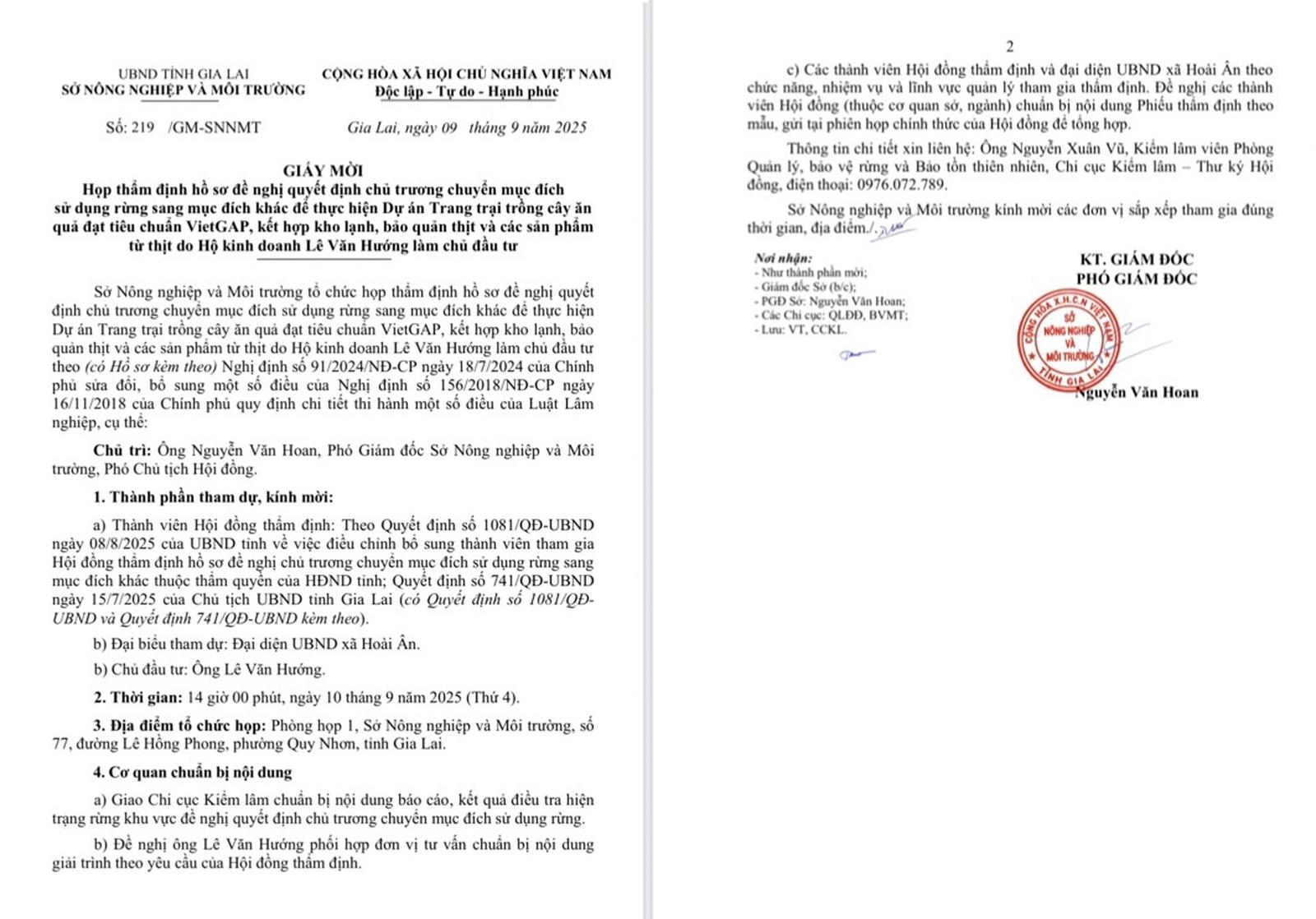 Giấy mời họp thẩm định hồ sơ đề nghị quyết định chủ trương chuyển đổi mục đích sử dụng rừng sang mục đích khác để thực hiện Dự án Trang trại trồng cây ăn quả đạt tiêu chuẩn VietGap, kết hợp kho lạnh, bảo quản thịt và các sản phẩm từ thịt do hộ kinh doanh Lê Văn Hướng làm chủ đầu tư. Ảnh: BT