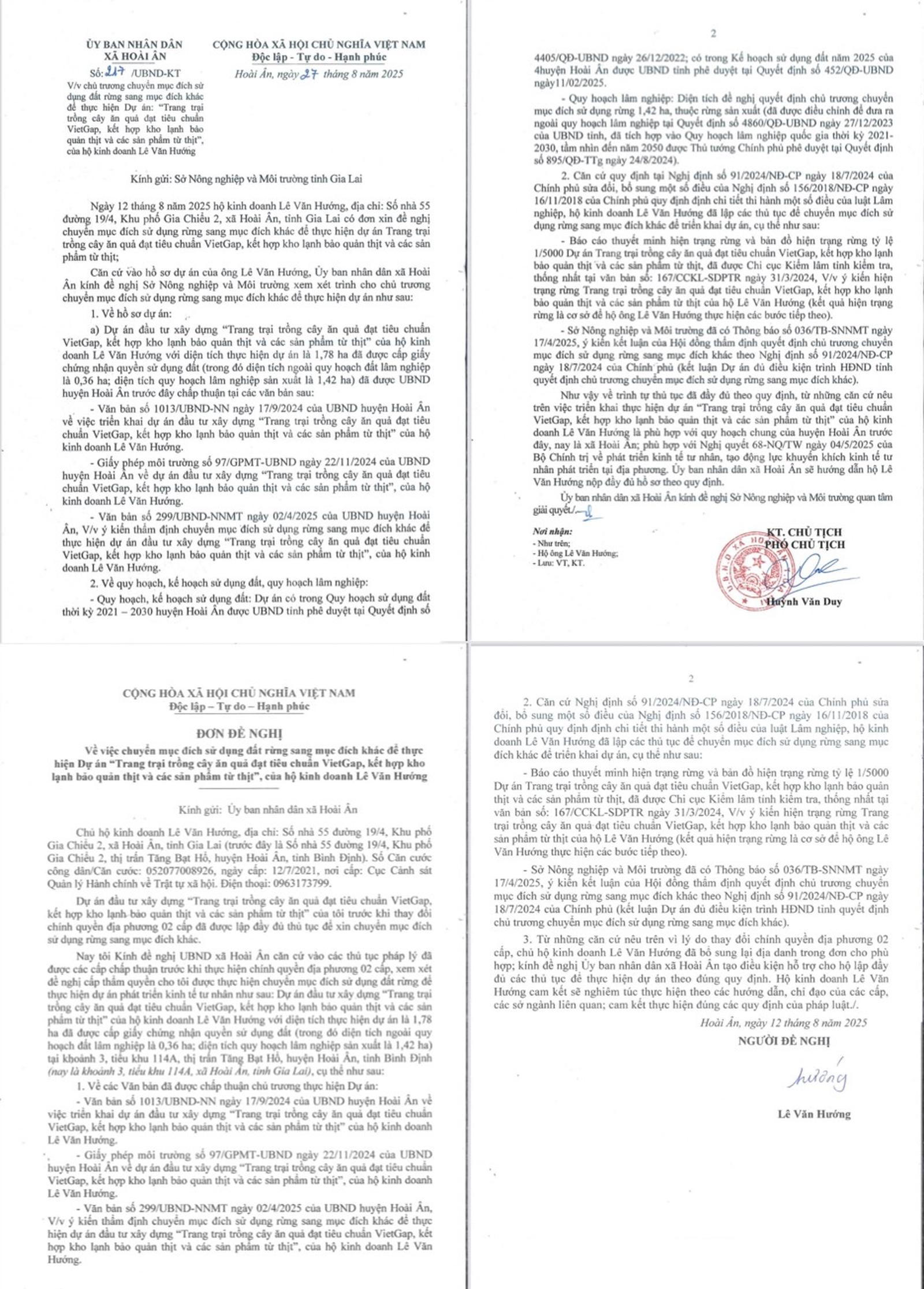 Báo cáo của UBND xã Hoài Ân và đơn đề nghị của hộ kinh doanh ông Lê Văn Hướng. Ảnh: BT
