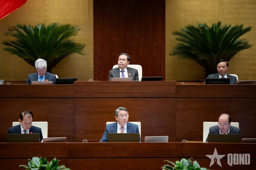 Đoàn chủ tịch và Đoàn thư ký Phiên họp Quốc hội tại hội trường, sáng 11-11. Ảnh: TRỌNG HẢI |