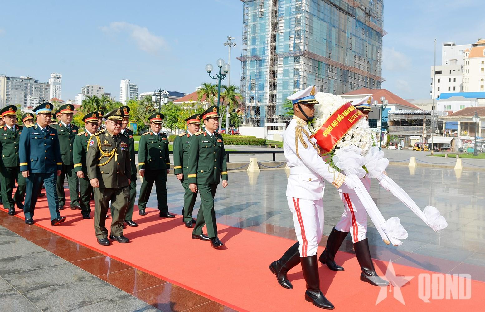 | Đại tướng Nguyễn Tân Cương và đoàn dâng hương, đặt vòng hoa tại Đài Hữu nghị Việt Nam - Campuchia ở Thủ đô Phnom Penh. |