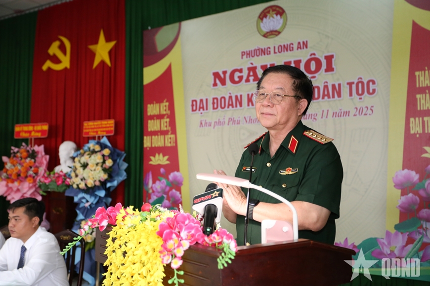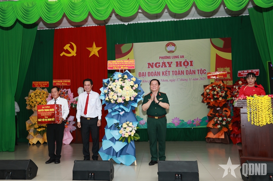 Sáng 17-11, Đại tướng Nguyễn Trọng Nghĩa, Ủy viên Bộ Chính trị, Bí thư Trung ương Đảng, Ủy viên Thường vụ Quân ủy Trung ương, Chủ nhiệm Tổng cục Chính trị Quân đội nhân dân (QĐND) Việt Nam dự Ngày hội Đại đoàn kết toàn dân tộc tại khu phố Phú Nhơn (phường Long An, tỉnh Tây Ninh).